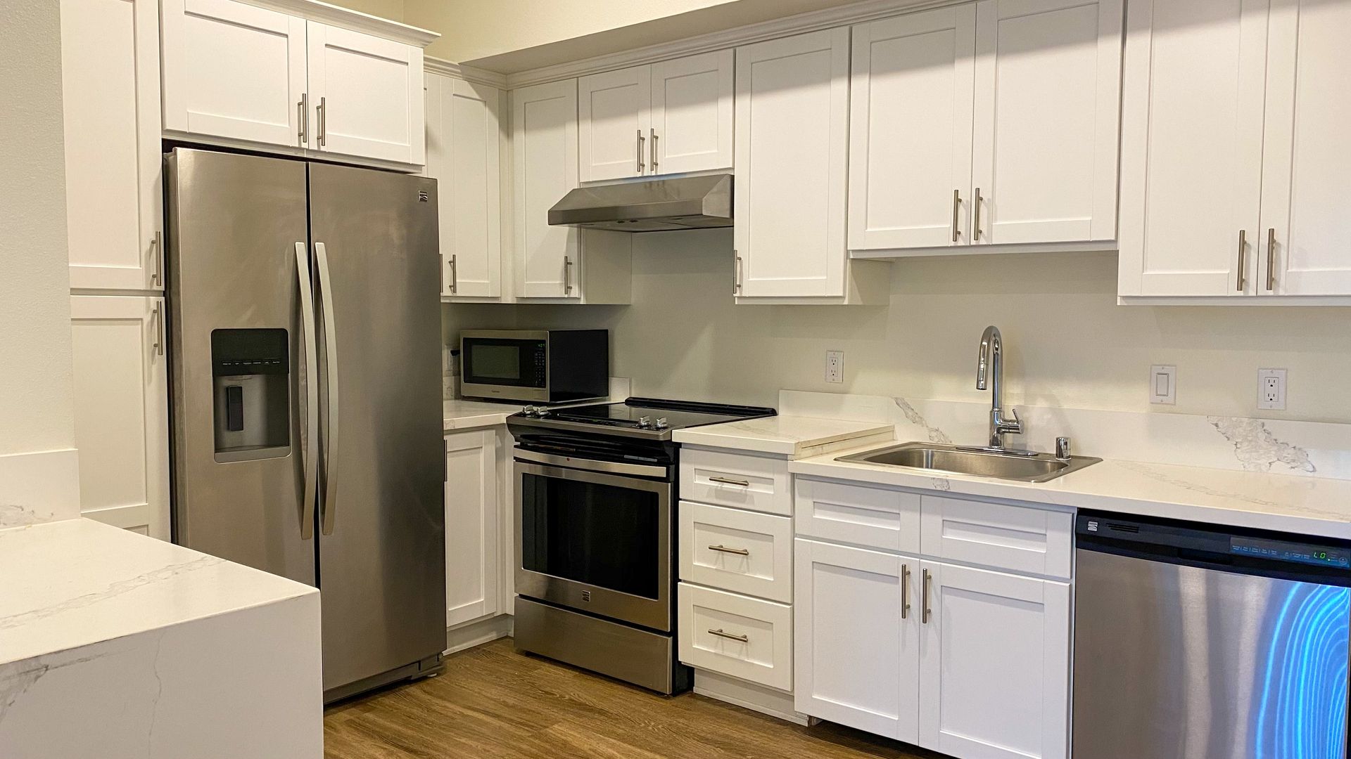 ➣Gourmet kitchen with stainless steel appliances: electric range, refrigerator, built-in vented microwave, dishwasher, and dual sink with spray faucet