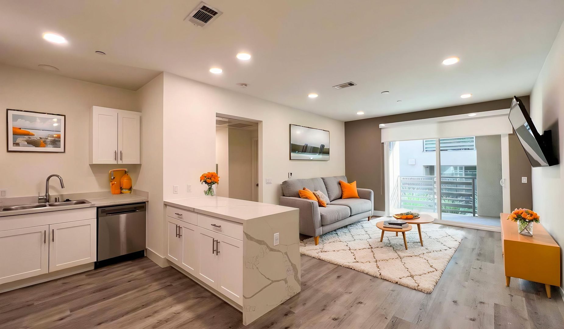 • Quartz Counters & European-Style Cabinetry